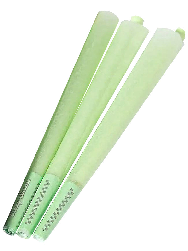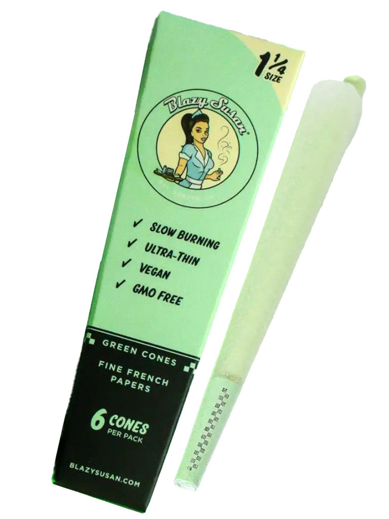 Limited Spacey Susan Edition green pre-rolled 1 1/4 cones for your next intergalactic adventure.  Blazy Susan uses a food safe dye for the coloration of their green paper products. The process is natural based, vegan, and GMO-free! This 6-pack comes with 2 stacks of 3 green cones, as well as eco-friendly green straws to make packing them even easier.